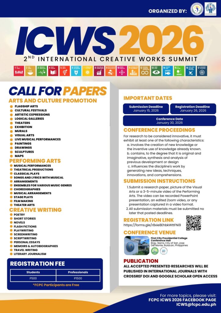 Be part of the International Creative Works Summit 2026 (ICWS 2026) with the goal of promoting creativity, innovation, and cultural expression across various disciplines in the arts. The event will be held on January 30, 2025, at First City Providential College, City of San Jose del Monte, Bulacan, Philippines.