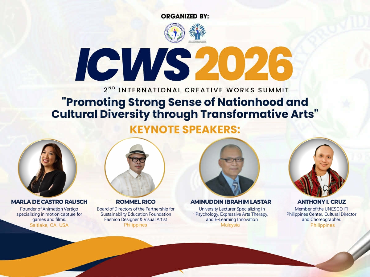 Be part of the International Creative Works Summit 2026 (ICWS 2026) with the goal of promoting creativity, innovation, and cultural expression across various disciplines in the arts. The event will be held on January 30, 2025, at First City Providential College, City of San Jose del Monte, Bulacan, Philippines.